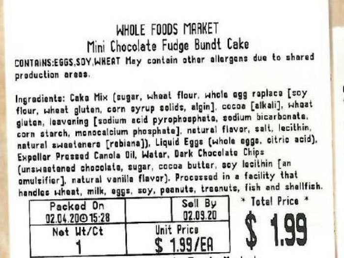 The affected products were sold at Whole Foods Market stores in Kentucky, Maryland, New Jersey, Pennsylvania, Ohio, Virginia and Washington D.C. The bundt cakes and cookies were available in the bakery department and sold in clear plastic packaging with Whole Foods Market scale labels. The cookies were also available on self-serve cookie displays and sold by the pound. The affected products can be identified by the following information.