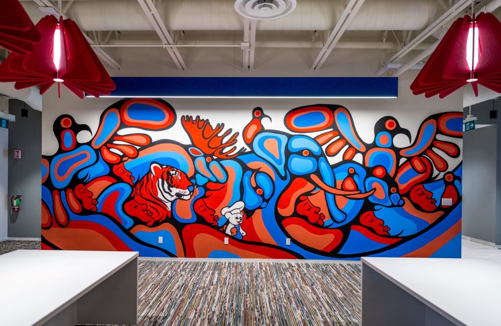 Bimbo Canada’s Legacy Space is a welcoming, physical and symbolic place dedicated to providing education and spreading awareness about Indigenous history and the journey of reconciliation. It features a mural commissioned by Blake Angeconeb, an Anishinaabe artist who, thorough his illustration, communicates how the company is ‘Moving Forward, Together’ by incorporating artistic elements from The Seven Teachings – a guiding Anishinaabe principle that supports living a good life in peace and without conflict.