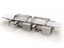 The Transver SDI product distribution station is designed for fully automated format changes and simple adjustment to product-specific characteristics. This results in a very short changeover time. Gap closing belts ensure a continuous product flow to the packaging machines. The design ensures gentle product handling and minimized cleaning effort while also keeping maintenance requirements low as no pushers, stoppers, and side guides are needed. Its stainless steel construction and modular design allow for easy cleaning and maintenance. The waiting belt and cross feeding belt are mounted on a removable trolley that allow for high accessibility.