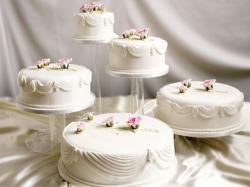 the traditional multi-tier cakes and the use of monograms and fresh flowers as