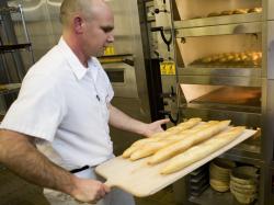 Photo Caption: Baking manager Mark Miller works in the massive industrial