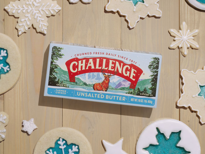 This year, Challenge is also introducing a limited-edition holiday pack, featuring their signature Elk in a festive winter setting. The box inside also features the signature Stained Glass Snowflake Cookie recipe.
