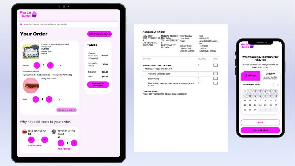 Unlike most ecommerce platforms, it then takes those orders and generates the prep sheets required for every stage of production and decoration in the bakery, as well as packaging and delivery instructions.