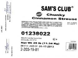 Sam’s Club Chunky Cinnamon Streusel was distributed from July 23, 2012 to September 7, 2012 in Sam's Club distribution centers in California, Missouri, Oklahoma, Texas, Utah and Wyoming. The product is sold in 25-pound round, white plastic pails identified with the following lot codes on the lower left corner of the label: