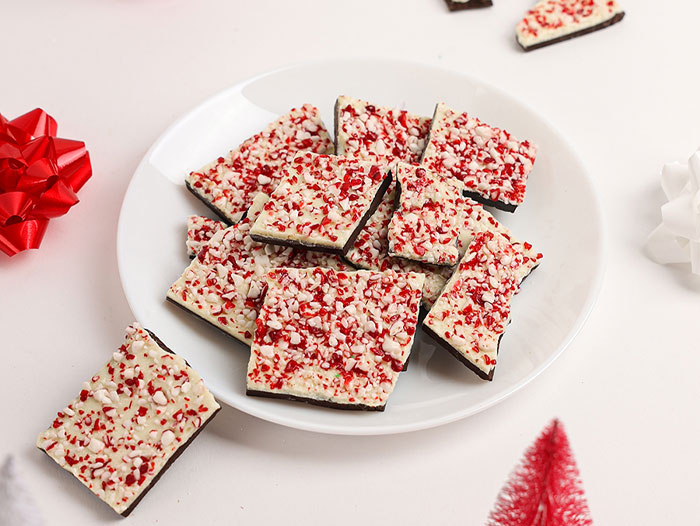 Peppermint Bark – Layers of rich dark chocolate and mint-infused white chocolate are topped with colorful crushed peppermint pieces.