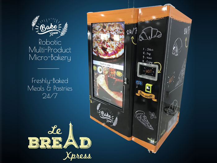 Le Bread Xpress combined robotic, AI, sensor, wireless, and heating technologies with artisan recipes to create Bake Xpress, a ground-breaking vending machine that custom bakes a variety of meals and pastries on demand. With a customizable menu ranging from croissants and muffins to pizza, calzones and gourmet sandwiches, Bake Xpress is a significant upgrade to traditional vending options. Le Bread Xpress was founded in 2015 and has installed Bake Xpress micro-bakeries in universities, hotels, retail centers, factories and office parks worldwide. For more information, please visit http://www.lebreadxpress.com.