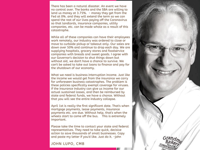 Here is a great message from John Lupo, CMB at Grandma’s Bakery. Please help us share this message. Our industry will be put to the test in the coming months and we need all of our voices heard!
