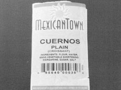 Cuernos are sold in clear plastic bags of three or four. Packages are marked as “Cuernos Plain (croissant)” with plain labeling or Mexicantown labeling, and the UPC code 95640 00035. Cuernos packages are distributed only in Michigan through retail stores.