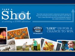 Until June 24th, consumers can visit Nature's Pride on Facebook to submit their photos and describe the adventures they would plan with the $5,000 grand prize. Then, from June 25th through July 2nd, fans and friends of Nature's Pride will vote on their favorite "Take a Shot" entries. Ten finalists will be selected based on those votes and a grand prize winner will be chosen from those finalists. The grand prize winner will receive $5,000 to plan the adventure of a lifetime and all 10 finalists will win free Nature's Pride for a month. Throughout the "Take a Shot" contest, fan can visit and view the gallery of entries.
