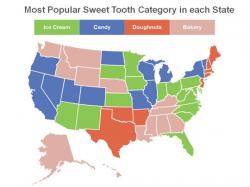 Infogroup also sought to find which sweet treat (ice cream, candy, bakery treats, or doughnuts) was the most popular in each state. Its data uncovered, among other findings, that candy stores are most popular in Oregon, while doughnuts are most popular in Texas.