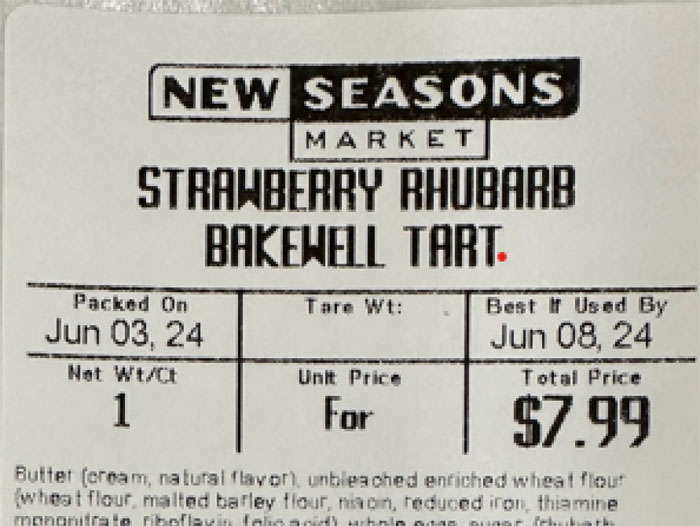 Strawberry Rhubarb Bakewell Tart was sold at the Bakery and Pastry departments in New Seasons Market stores located in Oregon and Washington from 03/22/24 to 06/03/24. Product has a 5-day shelf life.