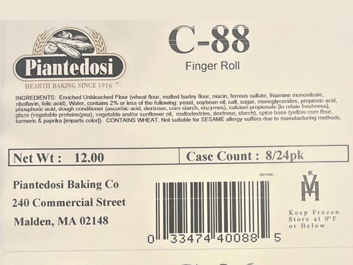 MALDEN, MA – Out of an abundance of caution, Piantedosi Baking Company, Inc. is voluntarily recalling select dinner rolls, sandwich rolls and bun products listed below that were used in limited products made between March 21,2022 and April 25, 2022, following the expanded Lyons Magnus recall dated August 10, 2022 recall of a raw material (FDA publish date August 16, 2022), used in limited production of dinner rolls, sandwich rolls and bun products from the manufacturer of Golden Gloss glaze (Lyons Magnus). Lyons Magnus is recalling this raw material due to the potential for it to cause microbial contamination, including the organisms Cronobacter sakazakii and/or Clostridium botulinum. While no illnesses associated with Piantedosi Baking Company, Inc. bread products have been reported and no pathogens have been found in Piantedosi Baking Company, Inc. products to date, this voluntary recall is being conducted out of an abundance of caution to ensure customer safety.