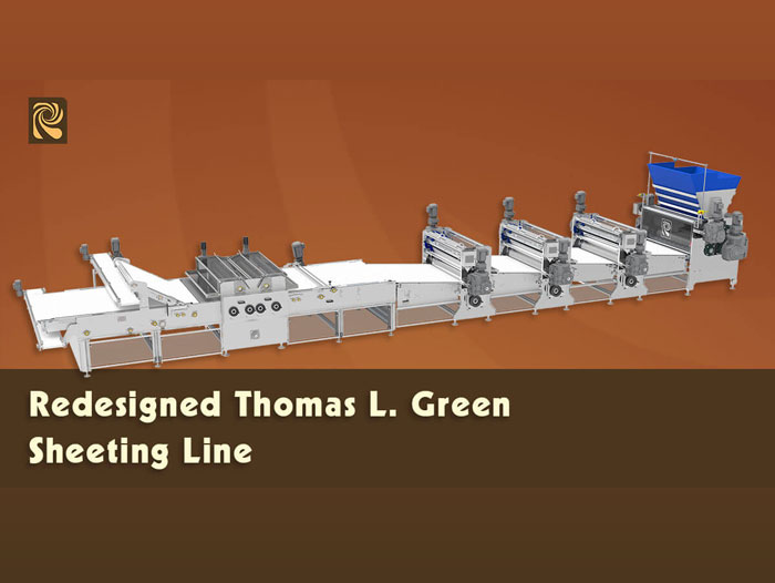 Reading Bakery Systems (RBS) has redesigned their Thomas L. Green Sheeting Line System to be a more streamlined and flexible system offering improved maintenance features and easier sanitation. The redesigned sheeting line offers expanded production capabilities while being easier to operate and maintain to produce crackers, biscuits, and baked crisps.