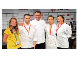 The Congress opened on Sunday, September 30, 2012, with the Pastry Competition featuring 20 competitors presenting pre-desserts. Trends were abundant in this year with Asian influences throughout. Ingredients and flavors that were noticeable in many dishes included sesame, rice, mochi, yogurt, goat cheese and cucumber; microgreens were also well utilized throughout plates. Critical to a pre-dessert, the frozen element that seemed most prominent this year was the semifreddo, the Italian term for a dessert that is "half frozen."