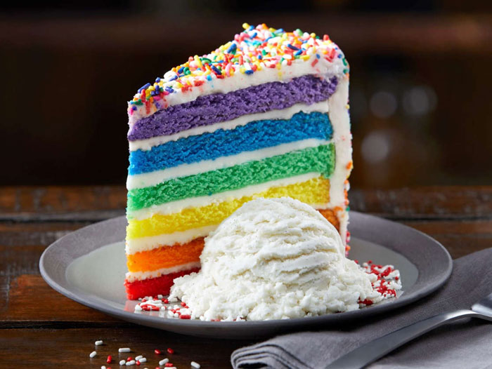 The confection is comprised of six layers of purple, blue, green, yellow, orange and red-colored vanilla cake, sweet vanilla icing, and rainbow sprinkles, and it’s now available by the slice and in whole form at TGI Fridays locations for an undetermined, but finite, amount of time.