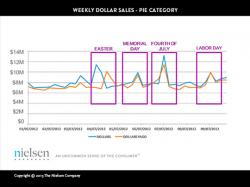 Pies will always have a place at holiday celebrations, but not just those occurring during the fourth quarter. Last year pie sales increased on each of the major spring and summer holidays compared with the prior year. Tying pie purchases with other commonly purchased categories for Easter, Memorial Day, Independence Day and Labor Day celebrations provides another leverage point to gain that one additional pie purchase and close the opportunity gap for the category.