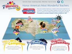 To nominate a wonderful teacher, visit the 7Wonders of the USA website at www.7wondersoftheusa.com and tell Wonder how a teacher has influenced a child today. On the site, parents and kids can learn about each of the 7Wonders with fun facts and family-friendly activities. They can also learn more about how Teach For America promotes educational excellence and equity across the country. The deadline for nominations is October 24, 2011.