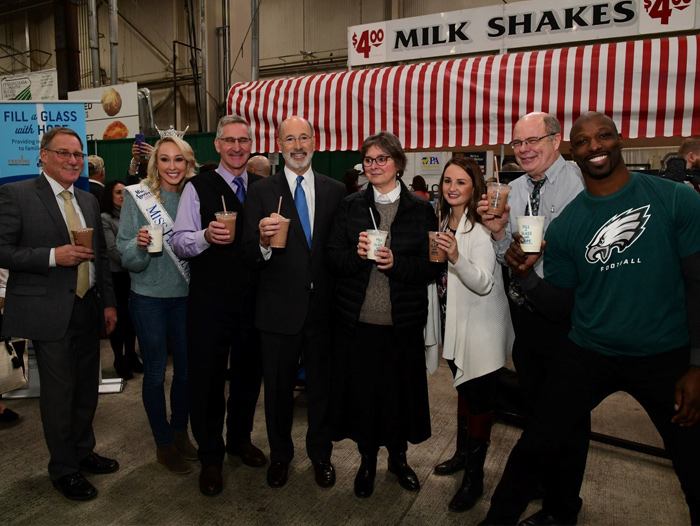 HARRISBURG, Pa. — With a celebratory milk toast and official bell ringing, Governor Tom Wolf, First Lady Frances Wolf, and Agriculture Secretary Russell Redding joined former NFL star, Jason Avant, dairy industry leaders, Feeding PA food bank leaders, Miss PA Kayla Repasky, Pennsylvania dairy royalty, and American Dairy Association North East (ADANE) to kick off the 2019 Fill a Glass with Hope® campaign, a charitable fresh milk distribution program at the Pennsylvania Farm Show Complex and Expo Center.