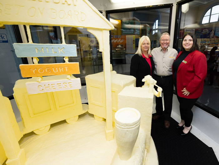 With a whimsical approach, the butter sculpture depicts a train being conducted by a cow and carrying young passengers fueling up on dairy foods. The train’s signage calls out “milk, yogurt and cheese” as vital ingredients in children’s diets, all of which are essential to achieve healthy growth, strengthen immune systems and reduce the risk of chronic disease.