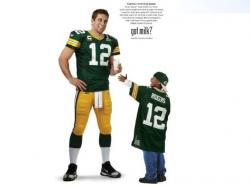 Rodger's ad copy reads, "Game-winning pass. Ever since I was a kid, my mom and coach taught me that to play my best, I need to fuel up to play 60. And one of the best ways to do that is with milk. Even now that I'm a Super Bowl champion, milk's still a part of my game plan. Make it a part of yours. got milk?"