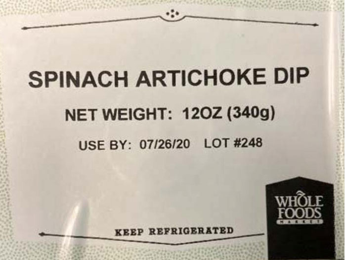 Winter Gardens Quality Foods, Inc., is voluntary recalling one of its products: Whole Foods Market Spinach Artichoke Dip carrying the lot code 248 and Use By: 07/26/20, because of an undeclared allergen (Egg). Consumers who have a food allergy or have severe sensitivity to Egg should not consume the product as it could result in a serious life-threatening allergic reaction. The lot code can be found printed on the lid.