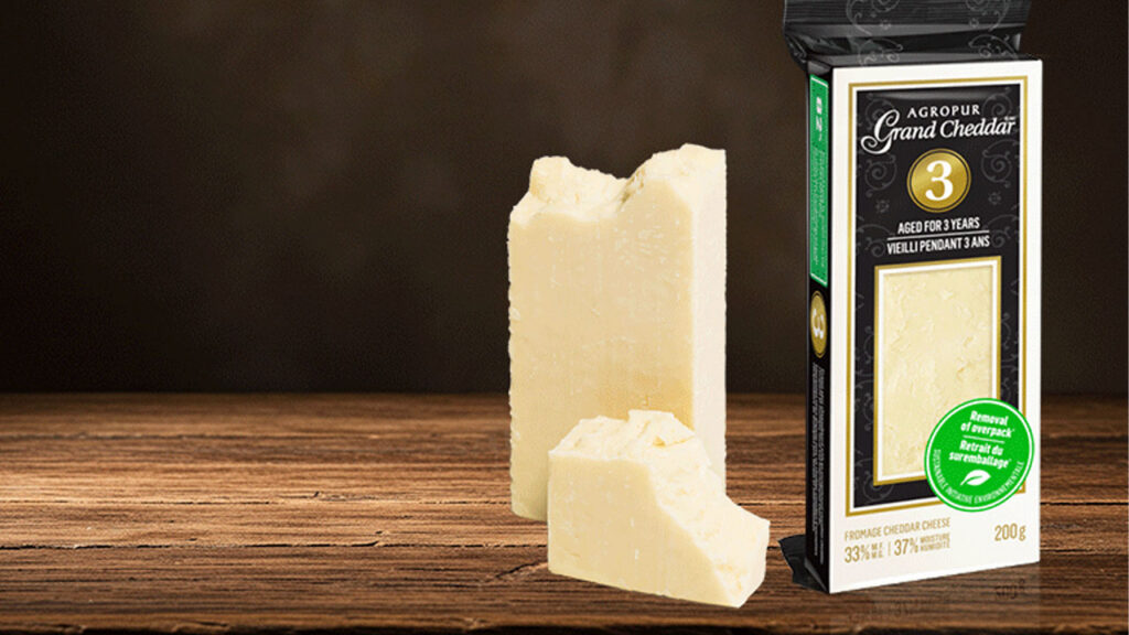 Agropur’s Grand Cheddar™ signature premium cheddar cheese transitioned from a paperboard overpack with plain flow wrap film to a stunning all-flexible package from Amcor, using AmPrima® Plus. To maintain the signature high-end look, Amcor employed Amplify® finishing technologies including matte overlacquer and metallic inks to make the product stand out.