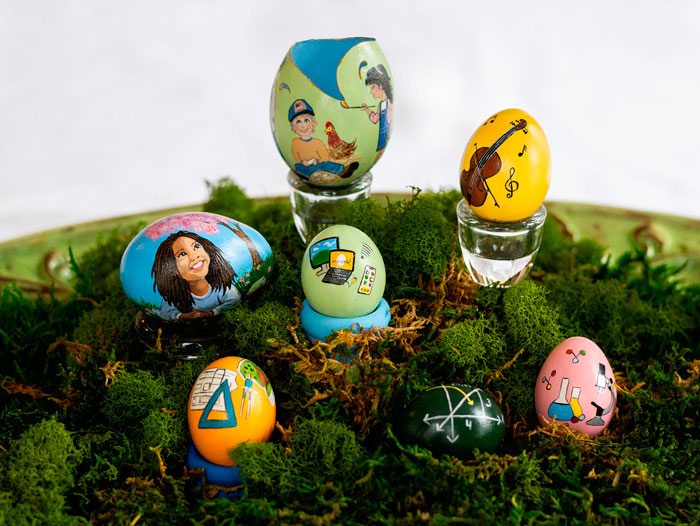 Made from actual chicken eggs, the 2024 First Lady’s Commemorative Egg features two large eggs surrounded by several “pullet” eggs from young hens. The painted design depicts a spring afternoon underneath the cherry blossoms, where a young girl dreams of all she can be when she grows up—such as an egg farmer, a teacher or president of the United States. An opening at the top of the egg reveals the interior of the egg painted with a vibrant blue sky above the world, symbolizing all that is achievable with a little imagination and the possibilities that come with the pursuit of knowledge. The pullet eggs depict the elements of a high-quality education that will aid this young girl in reaching her full potential.