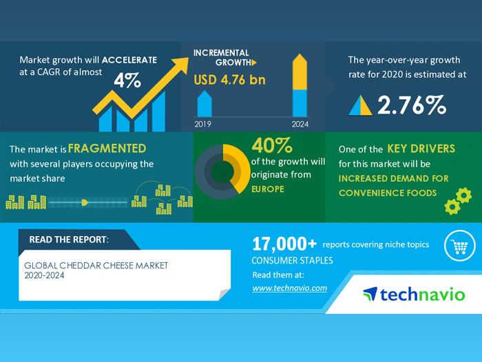 LONDON–Technavio has been monitoring the cheddar cheese market and it is poised to grow by USD 4.76 billion during 2020-2024, progressing at a CAGR of 4% during the forecast period. The report offers an up-to-date analysis regarding the current market scenario, latest trends and drivers, and the overall market environment.