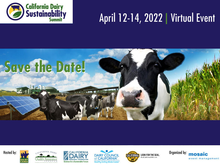 The California Dairy Sustainability Summit organizing committee today announced dates for the next event, which will take place April 12-14, 2022. The virtual summit will host timely discussions as dairy farmers and organizations around the world partner to reduce climate emissions and improve overall dairy sustainability. Speakers will highlight innovative technologies, partnerships, and projects on California’s family dairy farms as well as global efforts that are driving progress. Ultimately, the program aims to promote education and collaboration to ensure the continued availability of affordable, nutrient-rich foods—now and for future generations.