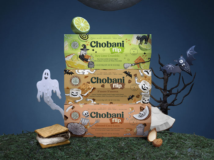 • An AR Trick or Treat Experience where you can scan the QR code on the packaging with any smartphone and step into the world of Halloween-themed Chobani® Flip®. Knock on doors to find tricks and a treat. After exploring the AR experience, participants can take a selfie with a mask inspired by the Flip® Halloween characters and share it with family and friends.
