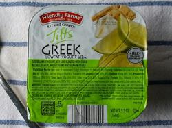 The product is Friendly Farms Key Lime Crunch Tilts which includes two compartments. One containing 1.5% Milkfat Key Lime Greek Yogurt and the other compartment containing white chunks and graham pieces. The container a 5.3oz plastic cup and is green and white.