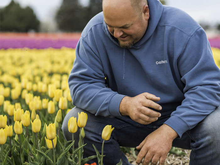 Jason VanderKooy of Harmony Dairy in Mount Vernon partners with neighboring tulip farms to provide nutrient-dense cow manure to grow the beautiful flowers that bring thousands of visitors to the Skagit Valley each April, which results in the crop farmers purchasing less commercial fertilizer. Manure from their cows, along with many food waste products that would otherwise go into a landfill, is also sent to their methane digester to produce 750 kw, which is enough power for 750 homes.