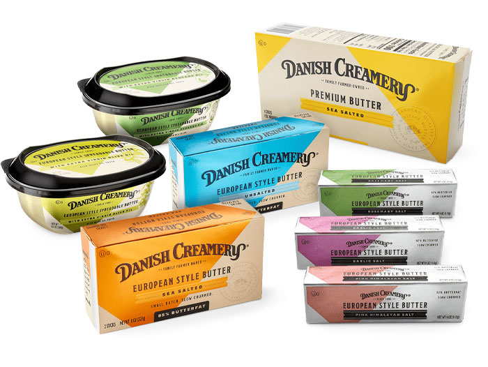 Danish Creamery butter is available in eight European-style varieties: salted and unsalted, spreadable butters with extra virgin oils, and three flavored specialty salt sticks. For full retail availability and more information, visit www.danishcreamery.com.