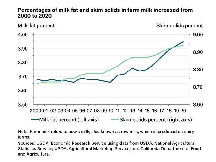 Milk consists of water, milk fat, and skim solids. Skim solids include protein, lactose, minerals, and trace elements. The average percentages of both milk fat and skim solids in farm milk (cows’ milk from dairy farms) have increased in the last two decades. In 2000, U.S. farm milk contained 3.68 percent milk fat and 8.72 percent skim solids on average. By 2020, the milk-fat percentage had grown to 3.95 percent, and the skim-solids percentage had increased to 8.94 percent. For skim solids, content increased gradually from 2000 to 2020, while milk-fat content began rising in 2011, after remaining relatively steady from 2000 to 2010.