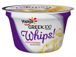 • Yoplait Greek 100 Whips!Yoplait's Greek 100 Whips! is a Greek yogurt mousse with 9 grams of protein per serving in a light and airy whipped texture. Available in eight delicious flavors, including Black Cherry, Strawberry, Strawberry Cheesecake, Vanilla Cupcake, Blueberry, Raspberry, Lemon Meringue and Tropical.