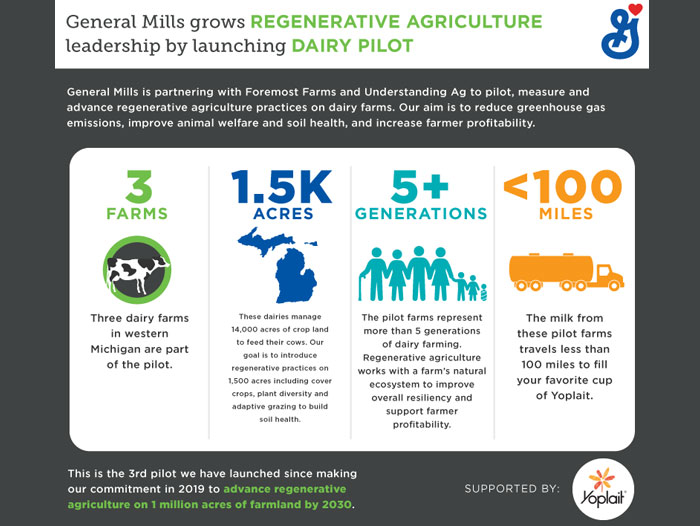 “As an industry, dairy farms have been especially hard hit in recent months and their resiliency is being tested. We believe regenerative agriculture builds and strengthens farmer resilience so they can better withstand pressures, be it societal, financial or environmental,” said Doug Martin, president of the General Mills U.S. yogurt business. “Consumers increasingly want to support brands and companies they trust are acting as environmental stewards. This pilot with Yoplait is a great example of the role our brands can play in unleashing the scale of our supply chain – supporting farmers, promoting animal welfare, and improving the health of the planet, all while delivering a great-tasting product.”