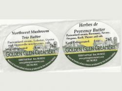 The product is sold in 4 oz. plastic round containers with tamper-evident seals. The labels read in part: “Herbes de Provence Butter”, or “Northwest Mushroom Trio Butter”, along with “GOLDEN GLEN CREAMERY” and “Natural handcrafted cheese produced by the Jensen ladies.” The top label on the products has a three-digit code “767.”