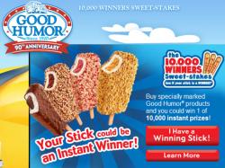 Players who find the instant-win message on the ice cream stick can visit www.GoodHumor.com to redeem one of several prizes, including Good Humor® 90th anniversary-edition T-shirts, hats and digital media gift cards. Instant winners are automatically entered for a chance to win the $10,000 grand prize drawing, but even ice cream fans with non-winning sticks can still enter for the chance to win the grand prize at the Good Humor® website. One grand prize winner will be selected via a random drawing and announced in September 2010.