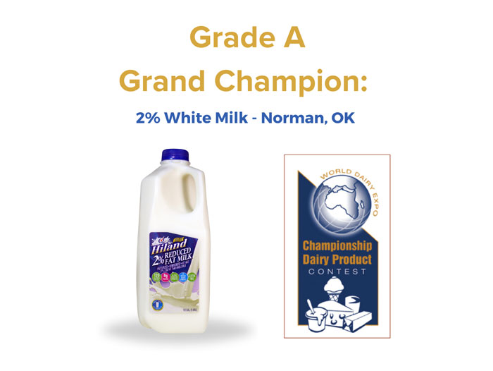 SPRINGFIELD, MISSOURI, UNITED STATES — Hiland Dairy’s Norman, Oklahoma, plant has earned the Grade A Grand Champion Award for its 2% white milk at the 2023 World Dairy Expo Championship Dairy Product Contest. Hiland’s 2% white milk beat other flavorful dairy products like dips, sour cream, yogurt, and cottage cheese to win the Grade A Grand Champion.