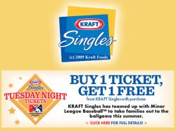 (1) Valid only on Tuesdays during home games April 13 – September 7, 2010. Purchase ticket(s) with KRAFT Singles package wrapper at ballpark box office. Subject to availability. Ticket offer not available in Allentown, Dayton, Indianapolis, Lansing, Montgomery, Pasco, Reno, Spokane, Tacoma or Vancouver. Exclusions apply. © 2010 All Minor League Baseball trademarks and service marks are used by KRAFT Singles with permission and under license from MiLB. All Rights Reserved.© 2010 Kraft Foods