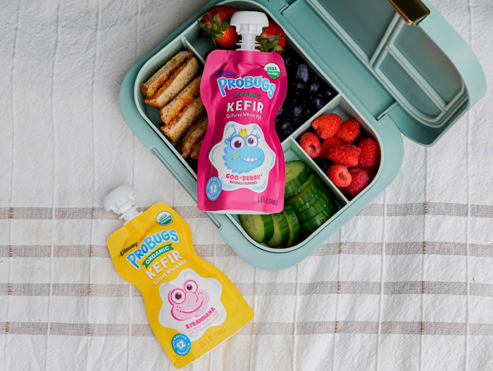 ProBugs kefir for kids is made with organic whole milk, plus Lifeway’s signature 12 live and active probiotic cultures. These family favorites feature a soft, squishable pouch and a no-spill spout that makes snack time worry free. They’re crafted with miniature microbiomes in mind and come in fun flavors kids crave.