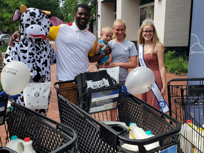 Photo caption: Dairy farmer Shelby Green from Coldsprings Farm in New Windsor, Md., Maryland Dairy Princess Ellie Feaga, and former Washington Football Team player Tim Hightower participate in a media event to kick off the Great American Milk Drive in a Washington, D.C., Safeway retail store.