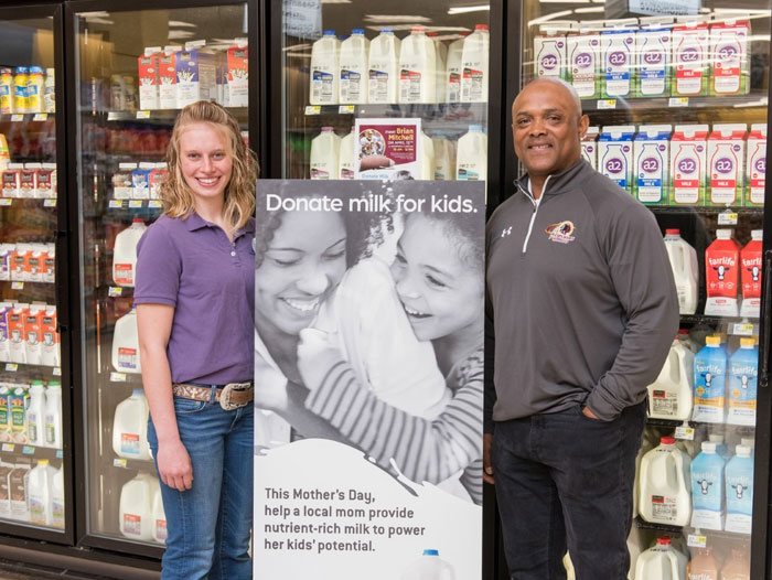 Photo caption: Dairy farmer Shelby Green from Coldsprings Farm, New Windsor, Md., participates in the Great American Milk Drive kickoff with former Washington Redskins player Brian Mitchell at the Shoppers Food & Pharmacy in Clinton, Md.