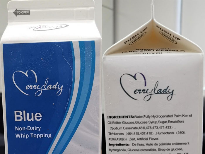 OTTAWA – Dolson Marketing Inc. is recalling Merrylady brand Blue Non-Dairy Whip Topping from the marketplace because it contains milk which is not declared on the label. People with an allergy to milk should not consume and retailers, restaurants, and institutions should not sell or use the recalled products described below.