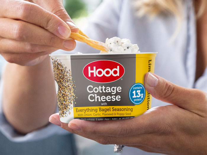 Irresistible Everything Bagel Seasoning meets rich and creamy Hood© Cottage Cheese in a new creation that is, well, everything! Delicious Hood© Cottage Cheese is expertly blended with onion, garlic, flaxseed and poppyseed for the perfect “everything” flavor in every bite. Packed with 13g of protein per serving and no added sugar, Hood® Cottage Cheese with Everything Bagel Seasoning makes for a great snack, ingredient, spread, topping or dip.