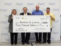 HAMILTON, ON – Egg Farmers of Ontario (EFO) wrapped up World Egg Month celebrations with a $30,000 donation to Breakfast for Learning at Westwood Elementary School, alongside Ontario Minister of Agriculture, Food and Rural Affairs, the Honourable Ted McMeekin last Friday. The cheque presentation was part of an "eggs-citing" morning of "egg-ducation" for two grade three classes who learned about egg farming in Ontario from area egg farmers and the famous travelling egg farm, complete with white and brown hens and a grading machine.