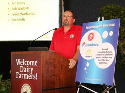 Photo caption: Jeff Raney – Jeff Raney, newly elected chairman of the Pennsylvania Dairy Promotion Program board of directors, provides a dairy checkoff update during the PDPP annual luncheon at Ag Progress Days.