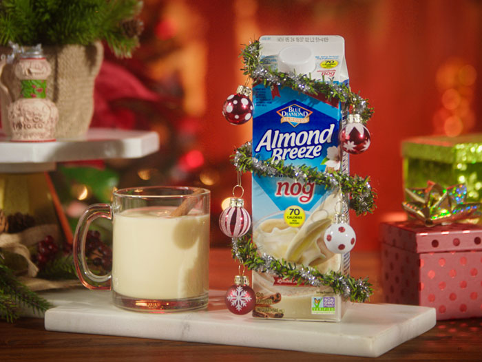 - Almond Breeze Almondmilk Nog: A limited-time holiday exclusive, this family favorite has the classic rich and creamy taste of traditional eggnog with only 70 calories per serving. Almond Breeze Almondmilk Nog is lactose-free, gluten-free, soy-free, and free of eggs. SRP: $4.19