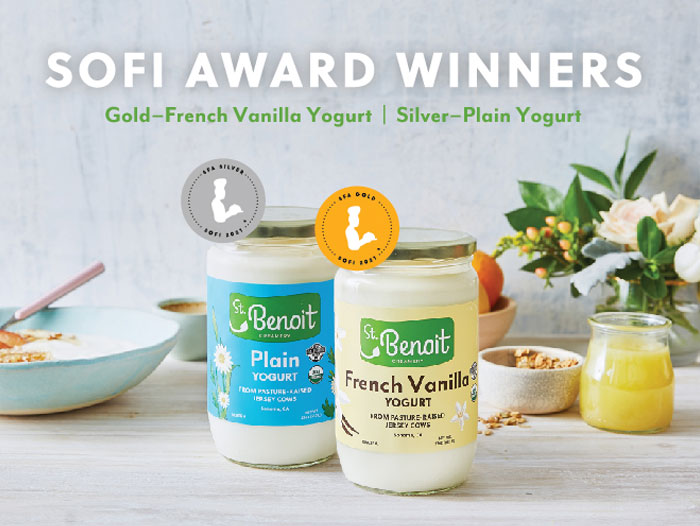 Sonoma, CA — For the second consecutive year, St. Benoit Creamery’s organic dairy products have been awarded the prestigious sofi™ Award recognizing the top products in the $158 billion specialty food industry. St. Benoit Creamery’s Organic French Vanilla Yogurt and Organic Plain Yogurt won gold and silver, respectively, in the Yogurt & Kefir category at the 2021 sofi™ Awards, where 130 winners emerged from nearly 1,500 competitors in 49 categories.