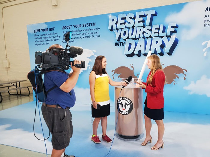 More than 80 volunteers from 12 county dairy promotion committees also helped ADA North East staff the “Reset Yourself with Dairy” booth during the fair. The booth featured a giant display geared toward the Gen Z audience, reminding them to “let milk help you reach new heights,” with two sets of milk splash “wings” and a giant glass of chocolate milk for photo opportunities. The display also included a giant milk carton with a QR code fair-goers could scan to get additional dairy messaging.